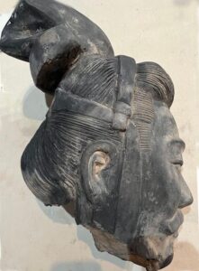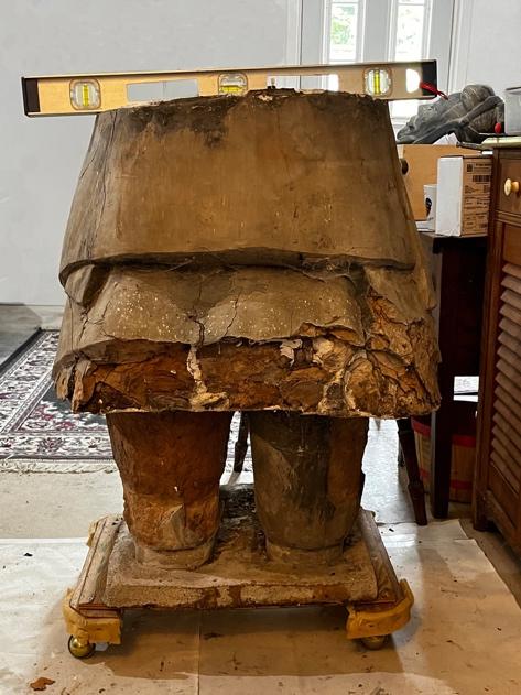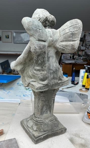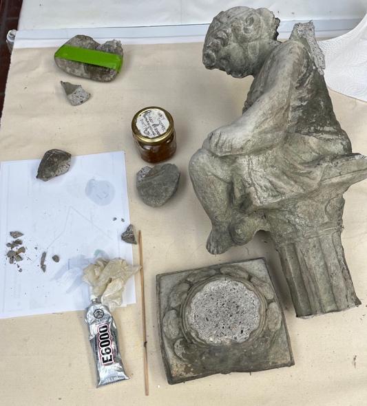This came to Susan in several pieces, and the base of the column had to be drilled so that a rod could be inserted to return stability to the statue. Other chips were pasted on with epoxy glue or remodelled in cement.